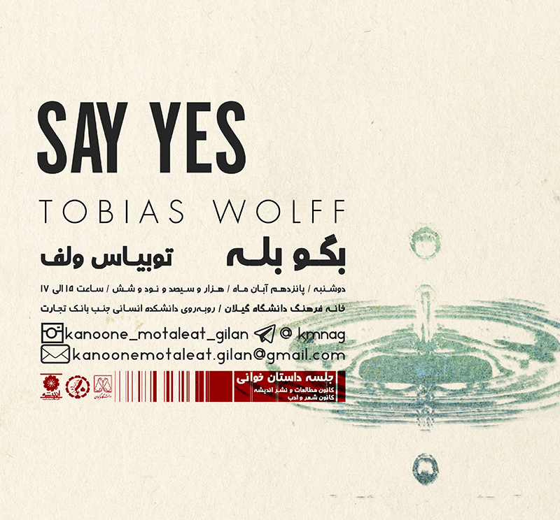 در این جلسه که در تاریخ در تاریخ 96/08/15 از ساعت 15 الی 17 در خانه ی فرهنگ دانشگاه گیلان برگزار شد، بگو بله داستانی از نویسنده ی آمریکایی، توبیاس ولف توسط دبیر کانون مطالعات خوانده شد. بعد از بحث و گفتگو در مورد داستان و نویسنده ی آن، داستان از زاویه های مختلف مورد نقد قرار گرفت.