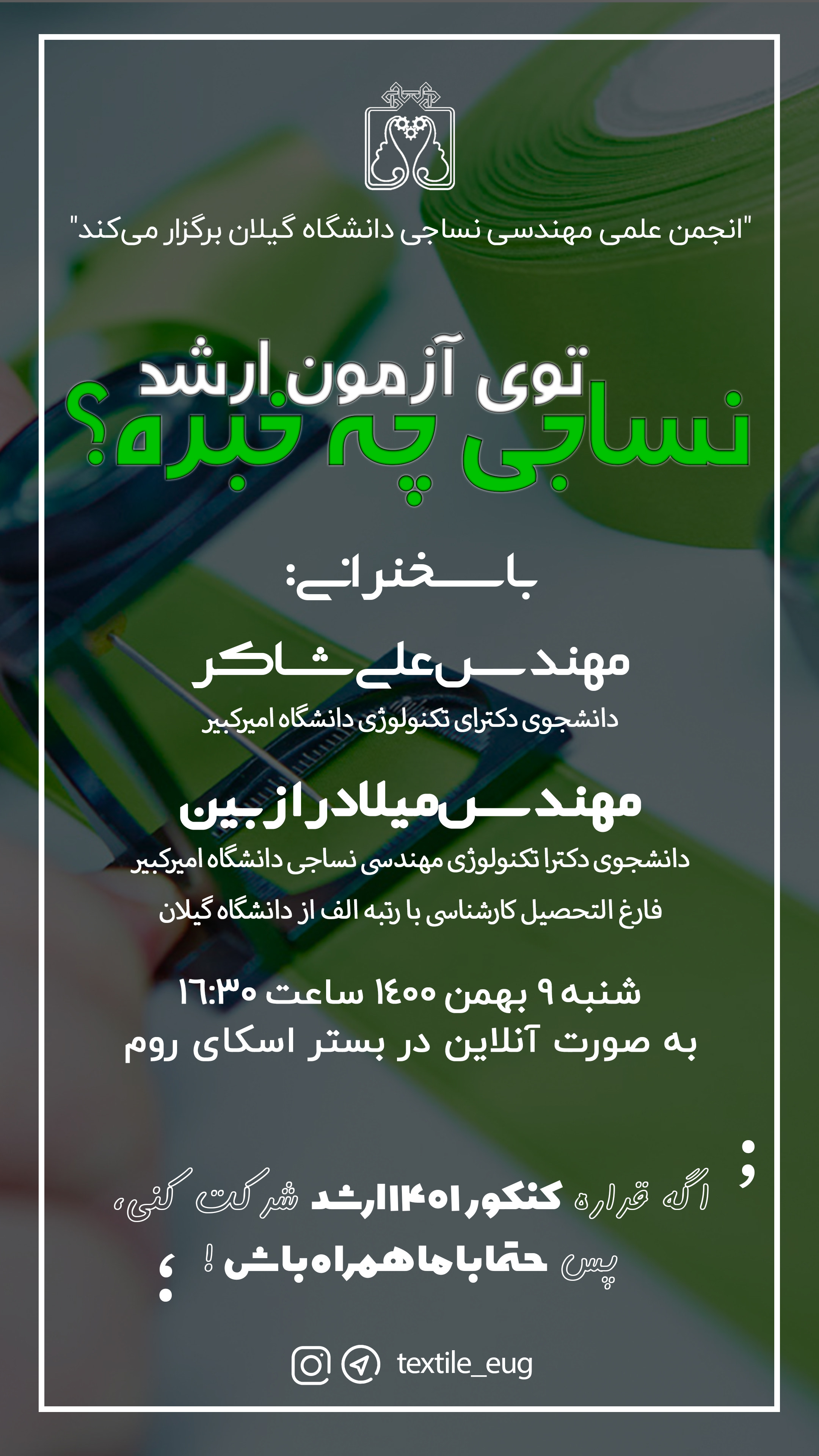 انجمن علمی مهندسی نساجی دانشگاه گیلان با هدف آشنایی با کنکور کارشناسی ارشد و چگونگی کسب رتبه عالی از آن؛ برنامه (توی کنکورارشد چه خبره؟) را 9 بهمن ماه1400با شرکت 30 نفر برگزار نمود.