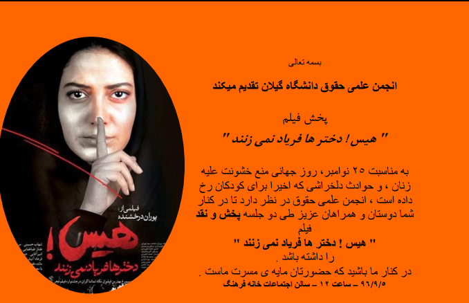 به همت انجمن علمی دانشجویی حقوق دانشگاه گیلان، پخش فیلم" هیس دخترها فریاد نمی زنند" مورخ 5 آذر ماه 96 در خانه فرهنگ دانشگاه گیلان برگزار شد. به منظور آشنایی با نظام دادرسی کیفری تمرکز این برنامه روی بعدحقوقی فیلم مورد پخش شده؛ بود . شایان ذکر است این فیلم دارای مجوز وزارت ارشاد بوده و دارای جوایز متعدد ملی و بین المللی می باشد .
