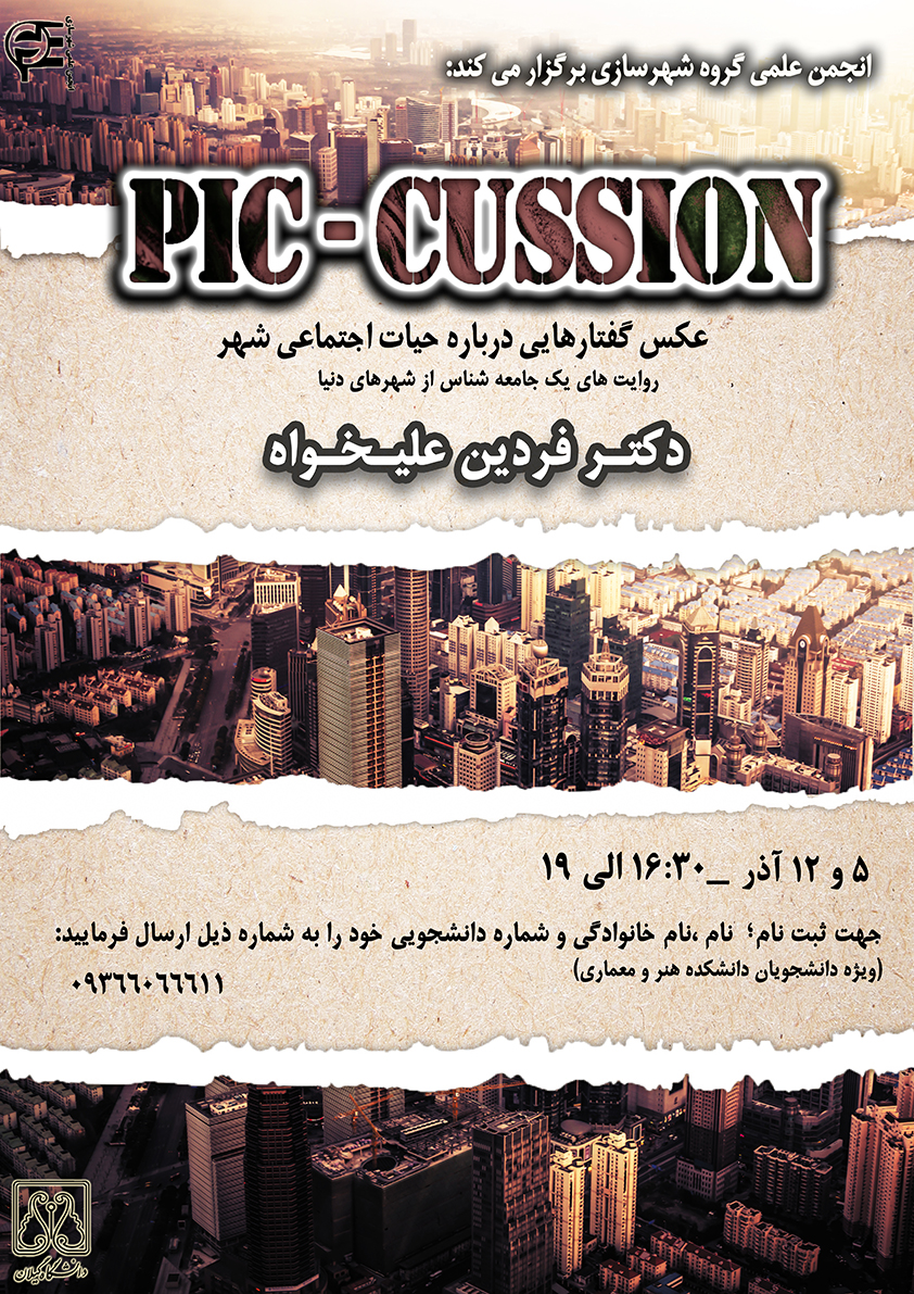 انجمن علمی دانشجویی شهرسازی دانشگاه گیلان برنامه پیکاشن (بررسی پیوند جامعه شناسی و شهرسازی) طی دو جلسه مورخ 5 و 12 آذر ماه 96 در دانشکده هنر و معماری برگزار نمود. در این برنامه به نمایش عکس هایی از بافت های مختلف شهری از کشورهای خارجی و تحلیل جامعه شناسانه ی آنها توسط  دکتر فردین علیخواه عضو هیئت علمی گروه علوم اجتماعی پرداخته شد که با مشارکت دانشجویان و بحث و گفت و گو پیرامون مسائل اجتماعی همراه بود. همچنین نقش طراحی شهری بر چگونگی رویدادهای اجتماعی در فضای شهر مورد توجه و بررسی قرار گرفت.