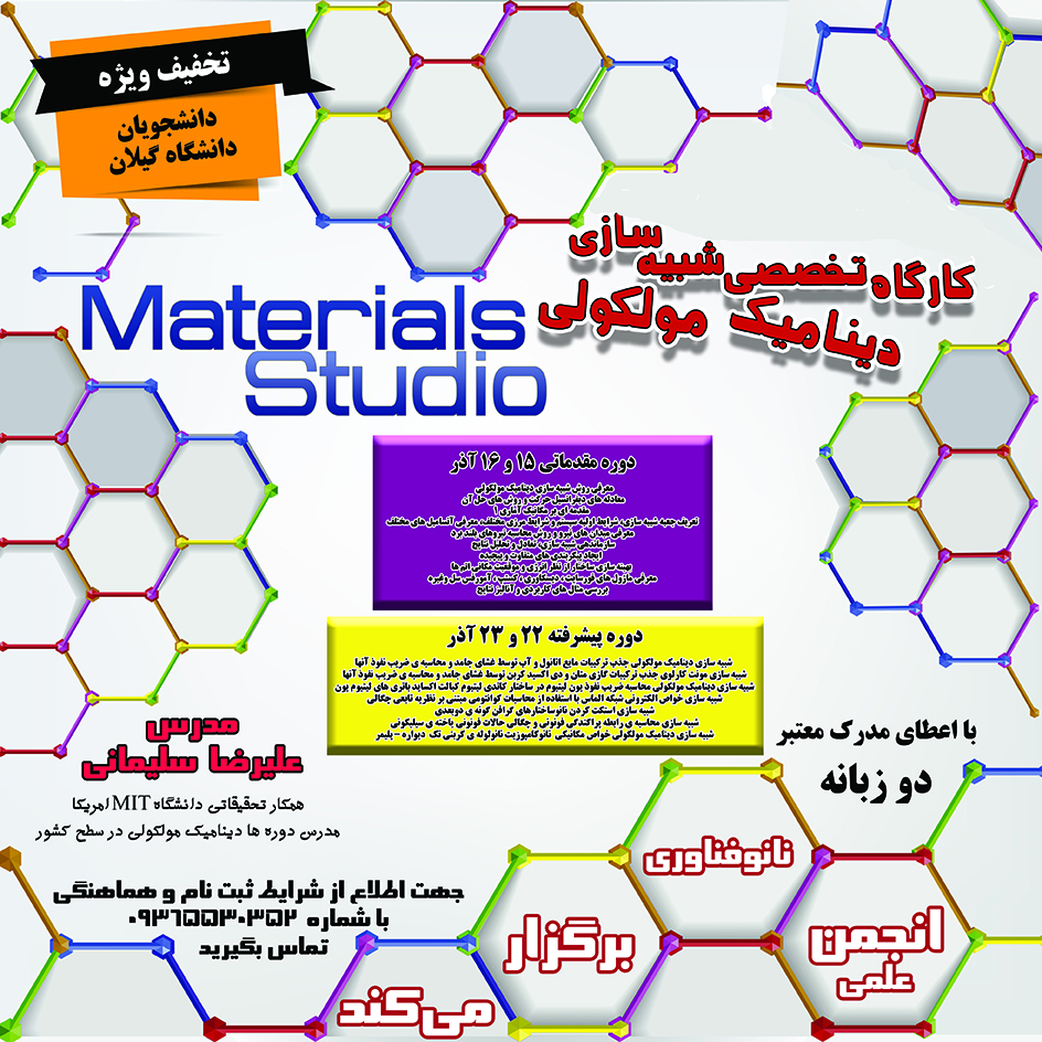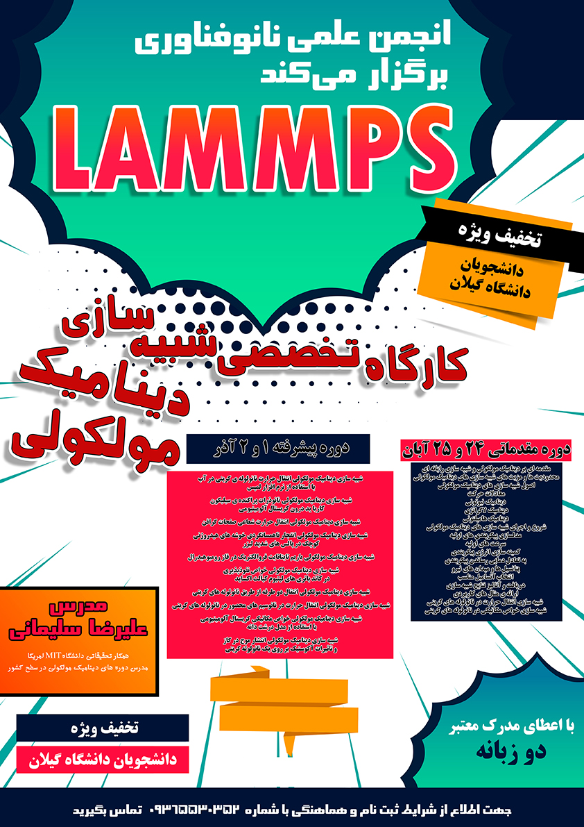 انجمن علمی دانشجویی نانو فناوری دانشگاه و مدیریت کارآفرینی دانشگاه گیلان، یک سلسله کارگاه های مهارت افزایی شبیه سازی دینامیک مولکولی LAMMPS وMaterials studio دوره مقدماتی و پیشرفته با اعطای مدرک دوزبانه؛ را  در تاریخ های  24ام و 25ام آبان، 1 ، 2، 15،16، 22 و 23 آذر ماه 97 برگزار می نماید. جهت هماهنگی و کسب اطلاعات بیشتر با شماره 09365530352 تماس حاصل نمایید.