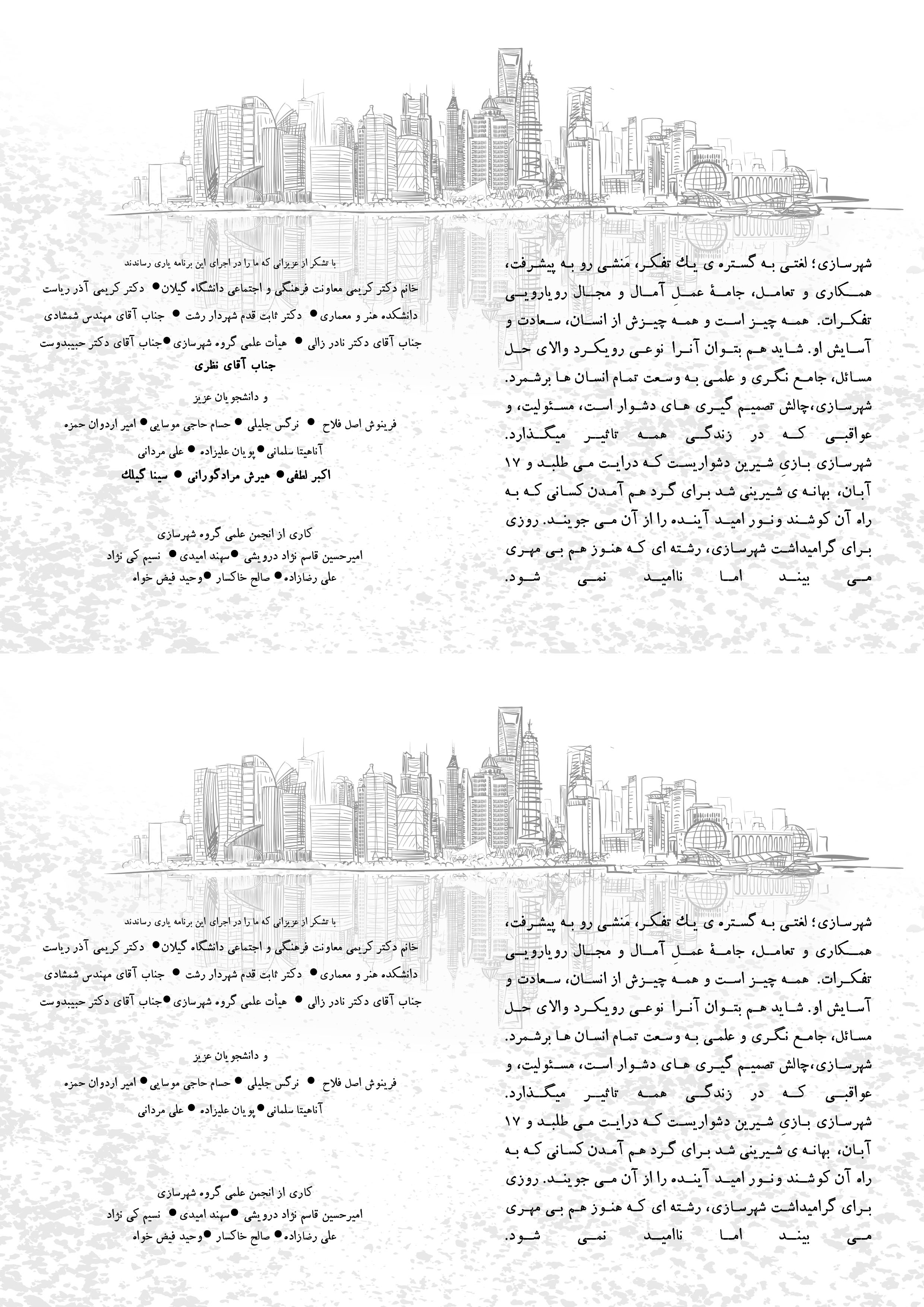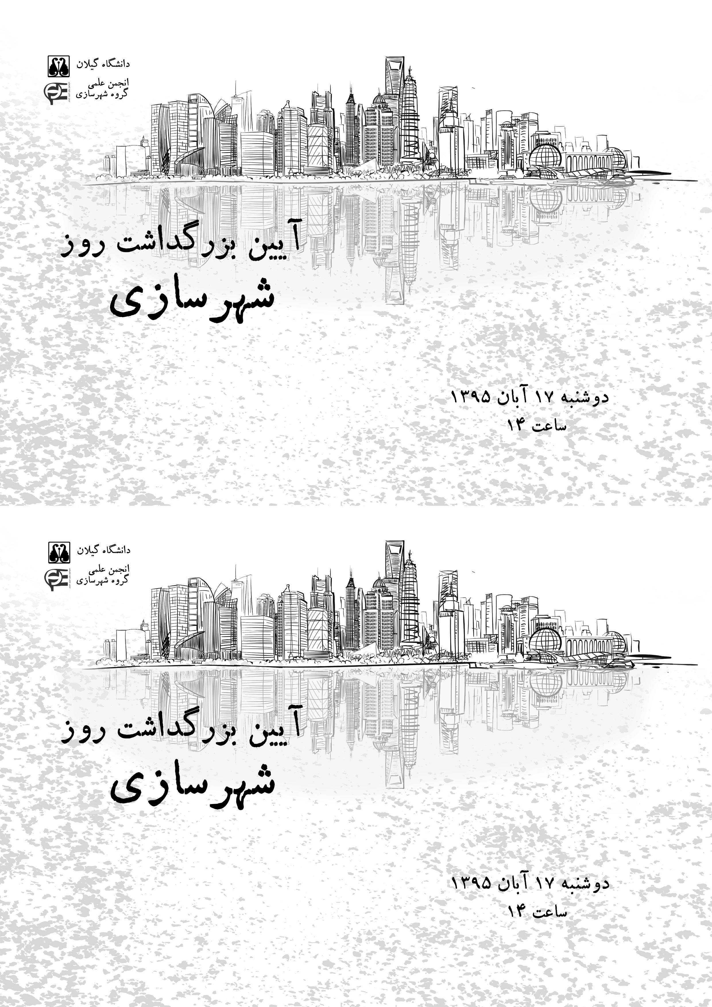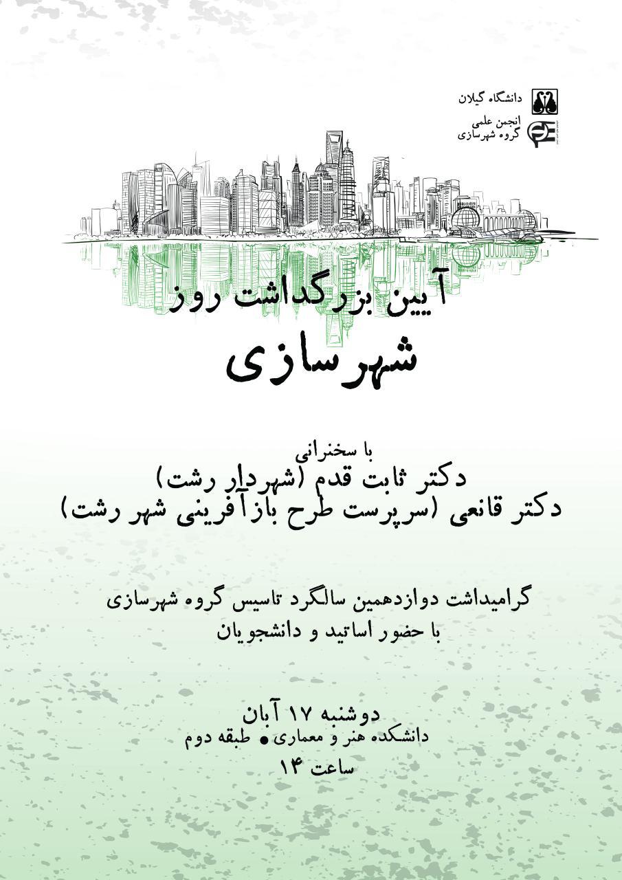 انجمن علمی دانشجویی شهرسازی دانشگاه به مناسبت گرامی داشت روز جهانی شهرسازی، مراسمی را در روز 17 آبان ماه 95 در دانشکده معماری و هنر دانشگاه گیللان برگزار نمود . در این مراسم که با حضور آقای دکتر حسن احمدی پیشکسوت شهرسازی، آقای روبرت واهانیان پژوهشگر گیلان شناس و شهرساز، اساتید و دانشجویان دانشکده برگزار شد، دکتر ثابت قدم شهردار شهر رشت ،دکتر محمد رضا قانعی سرپرست طرح باز آفرینی شهر رشت و دکتر صابر محمد پور عضو هیئت علمی گروه شهرسازی و معاون پژوهشی ـ اجرایی دانشکده معماری دانشگاه گیلان سخنرانی نمودند. از دیگر برنامه های این مراسم تقدیر از میهمانان ویژه، پنل پرسش و پاسخ و اجرای موسیقی سنتی بود.