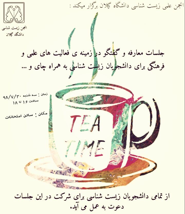 انجمن علمی دانشجویی زیست شناسی دانشگاه گیلان به منظور آشنایی دانشجویان وردوی 98 با انجمن علمی و اهداف و برنامه های آن جلسه ای با عنوان Tea Time را در تاریخ 30 مهر ماه 98 برگزار نمود.